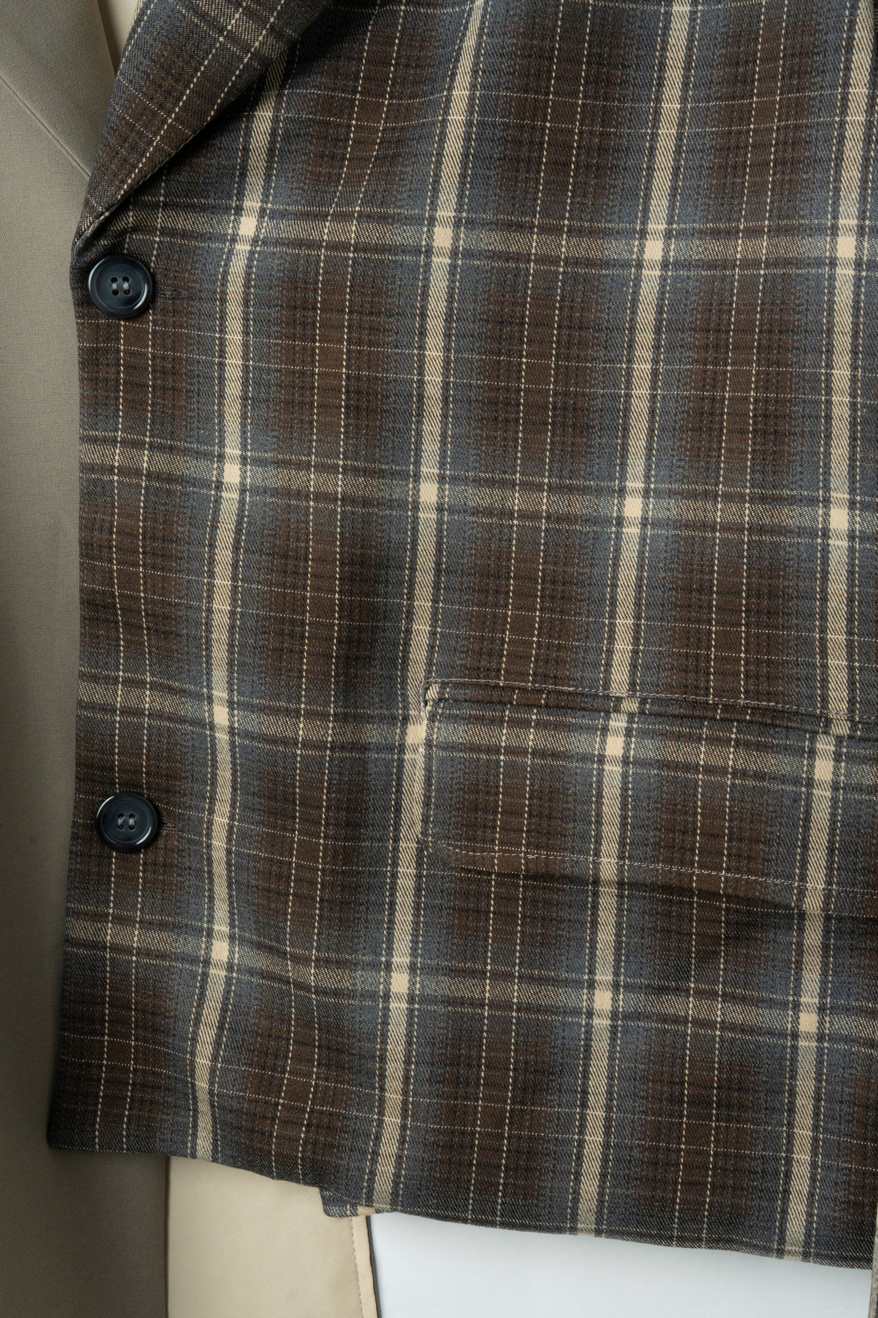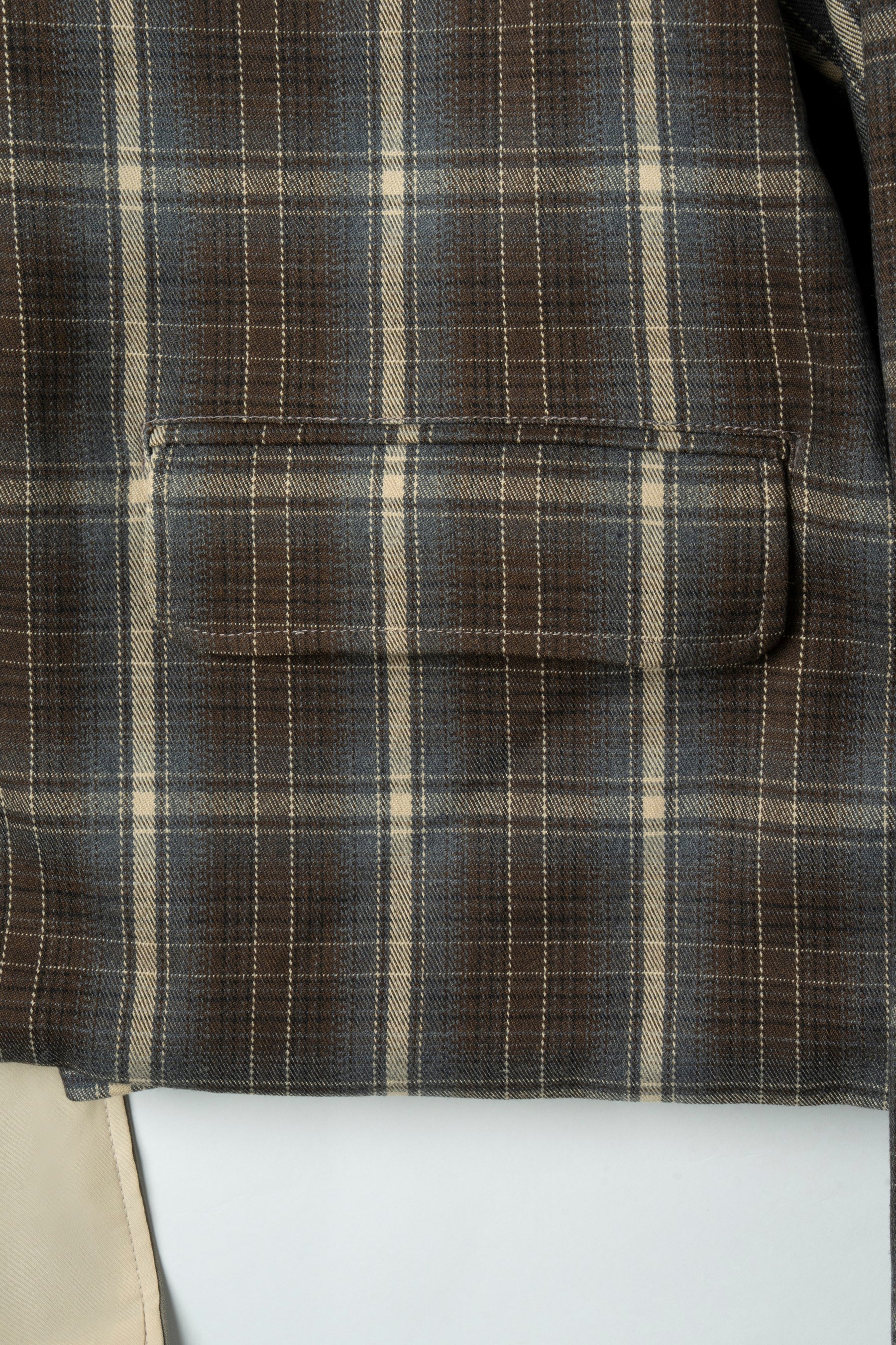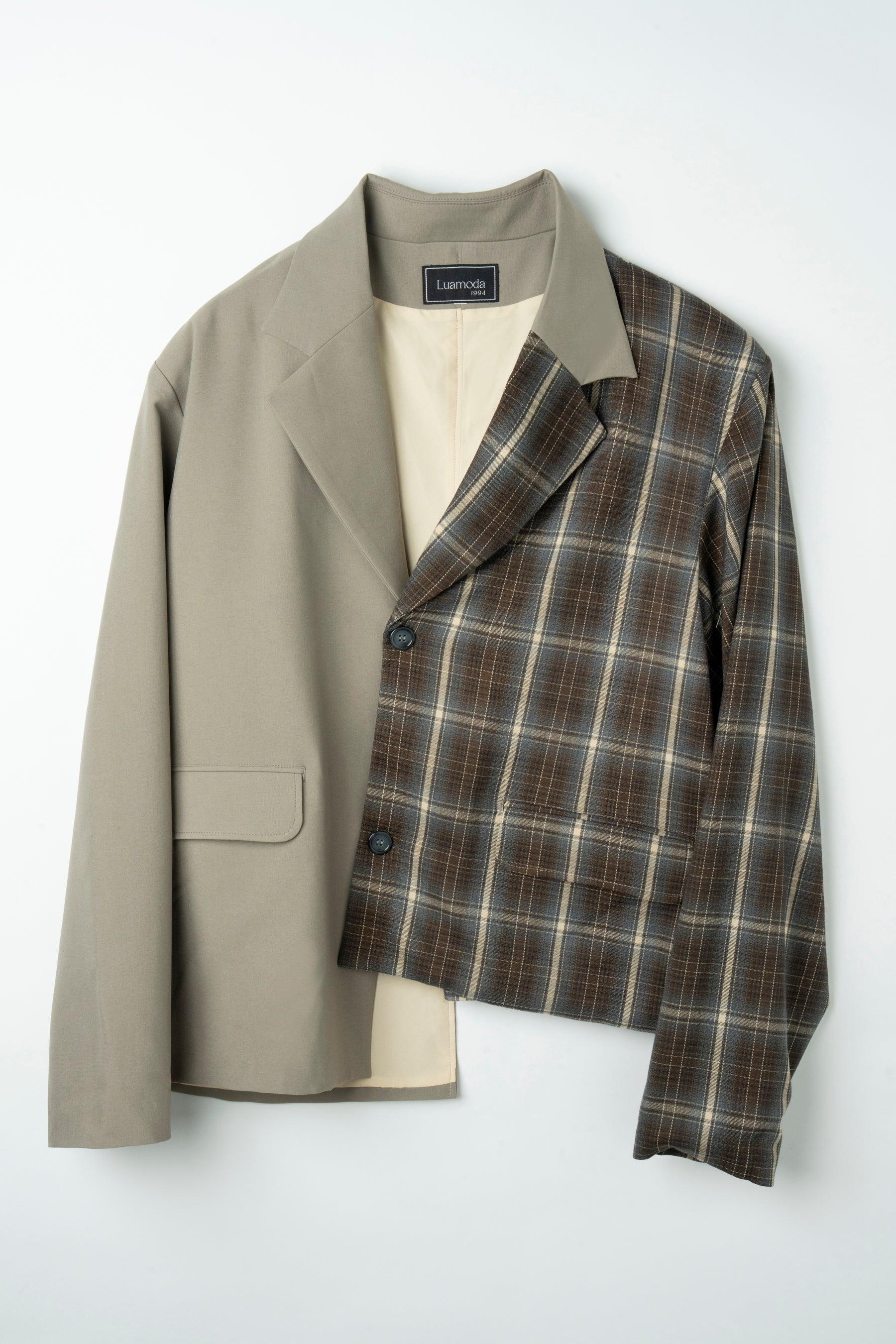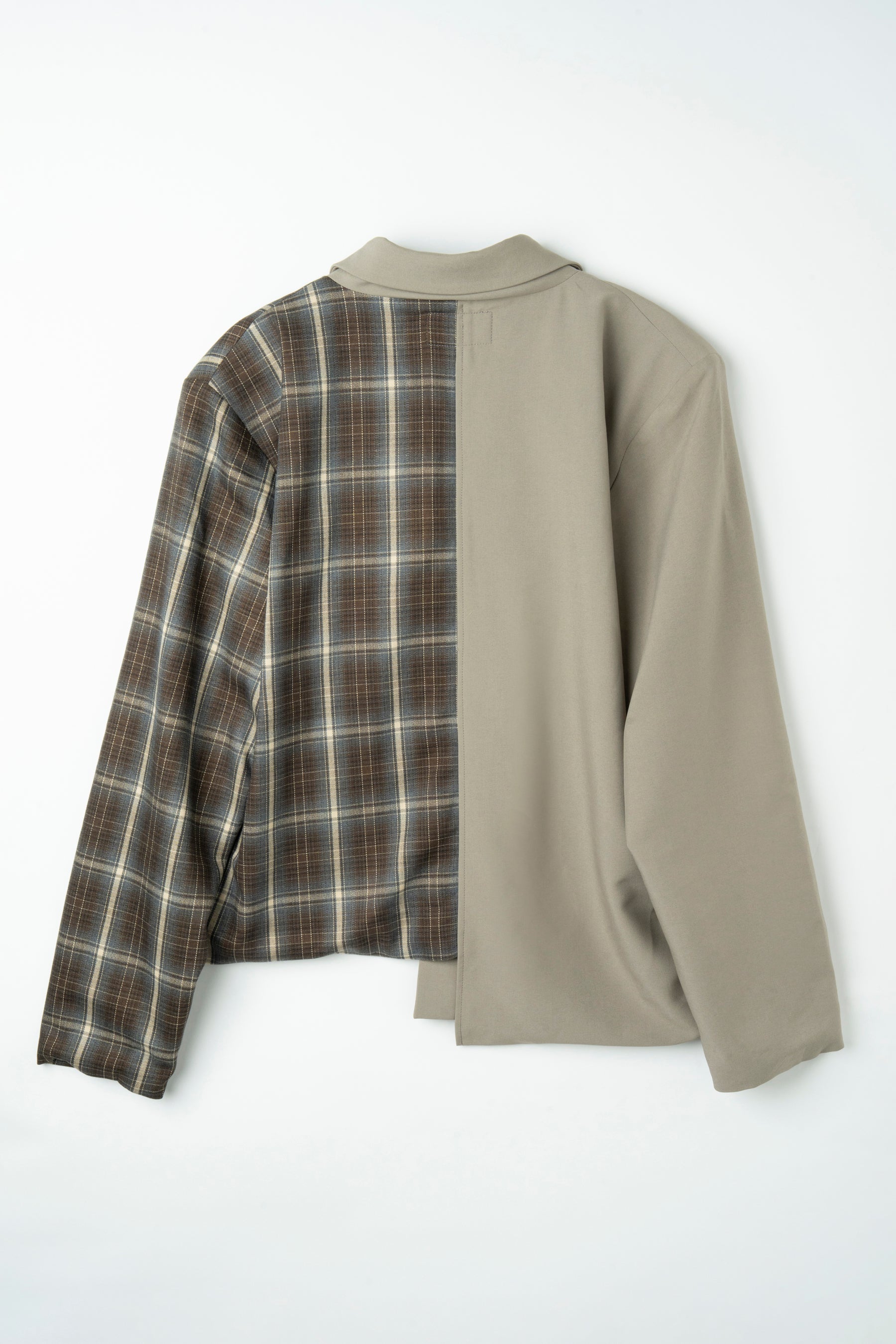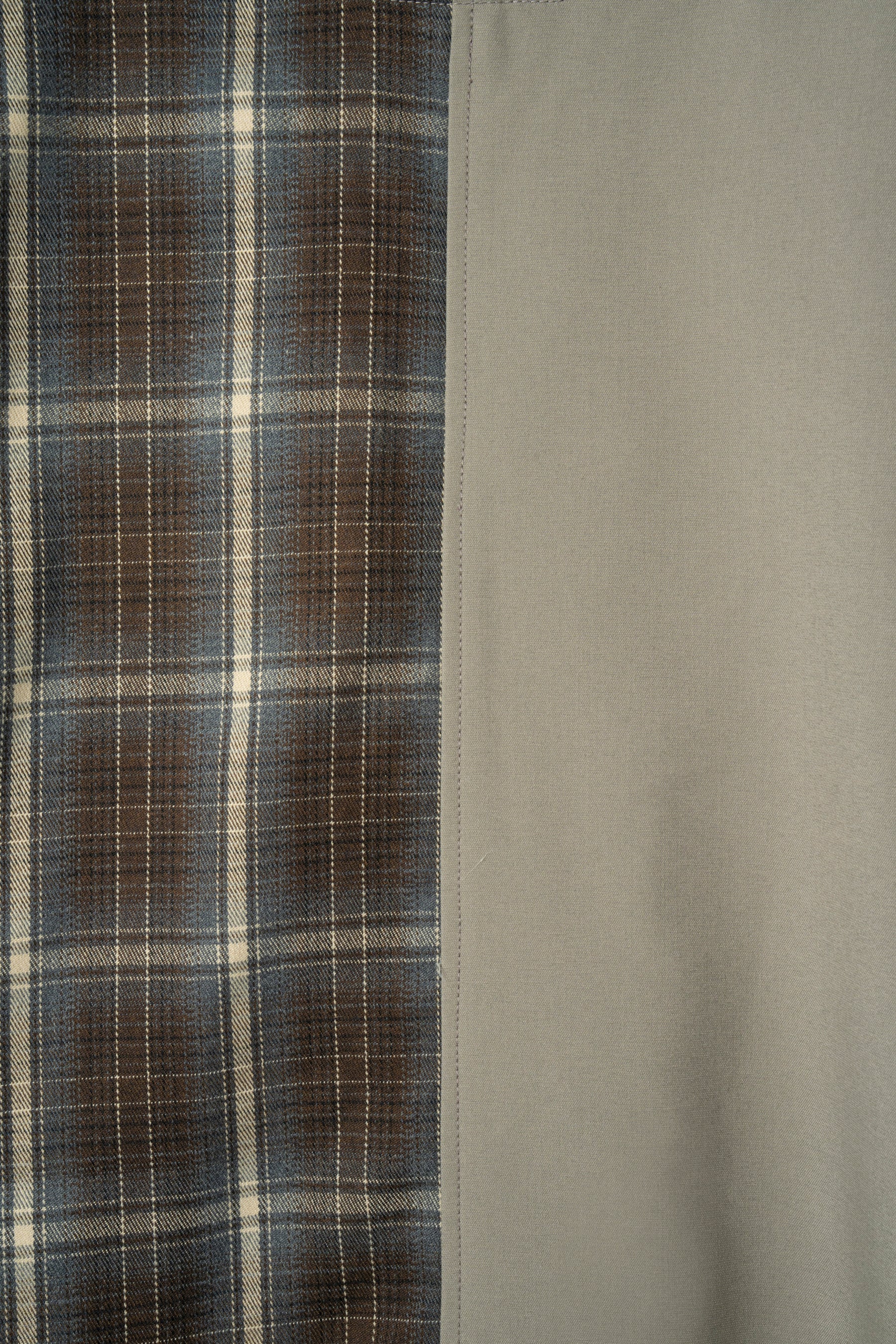 半身を大胆にチェック生地にてドッキングさせた個性溢れる一着。