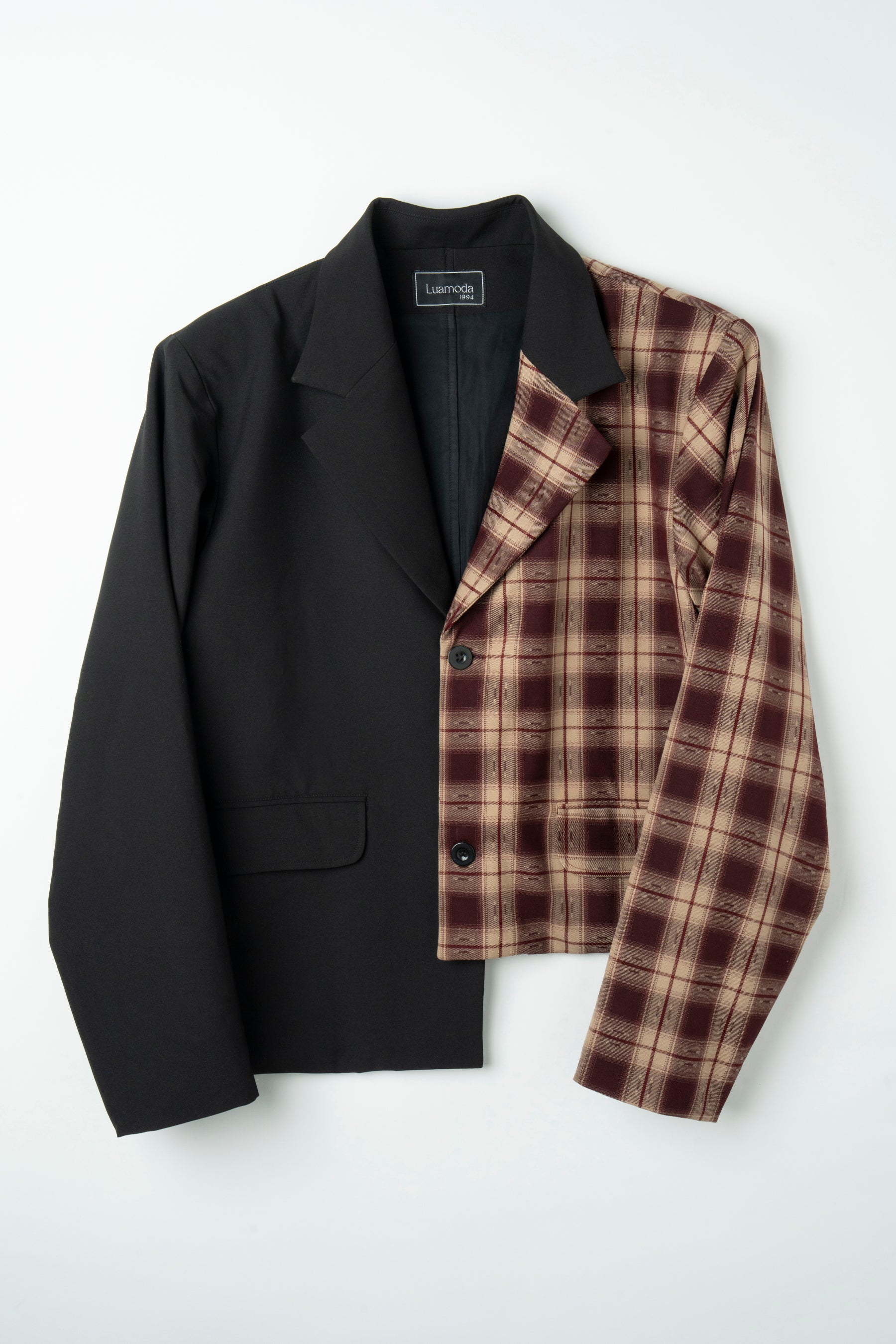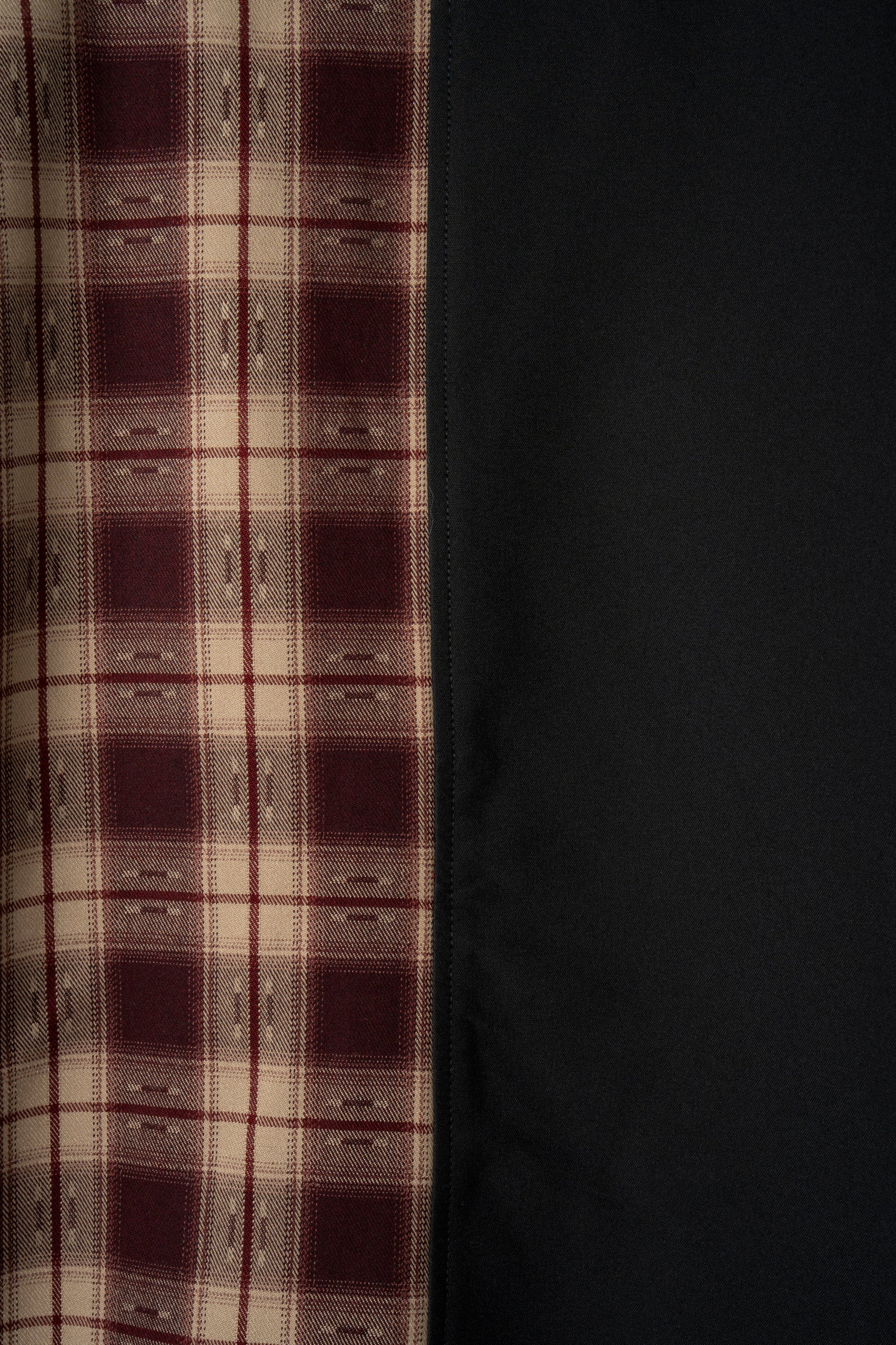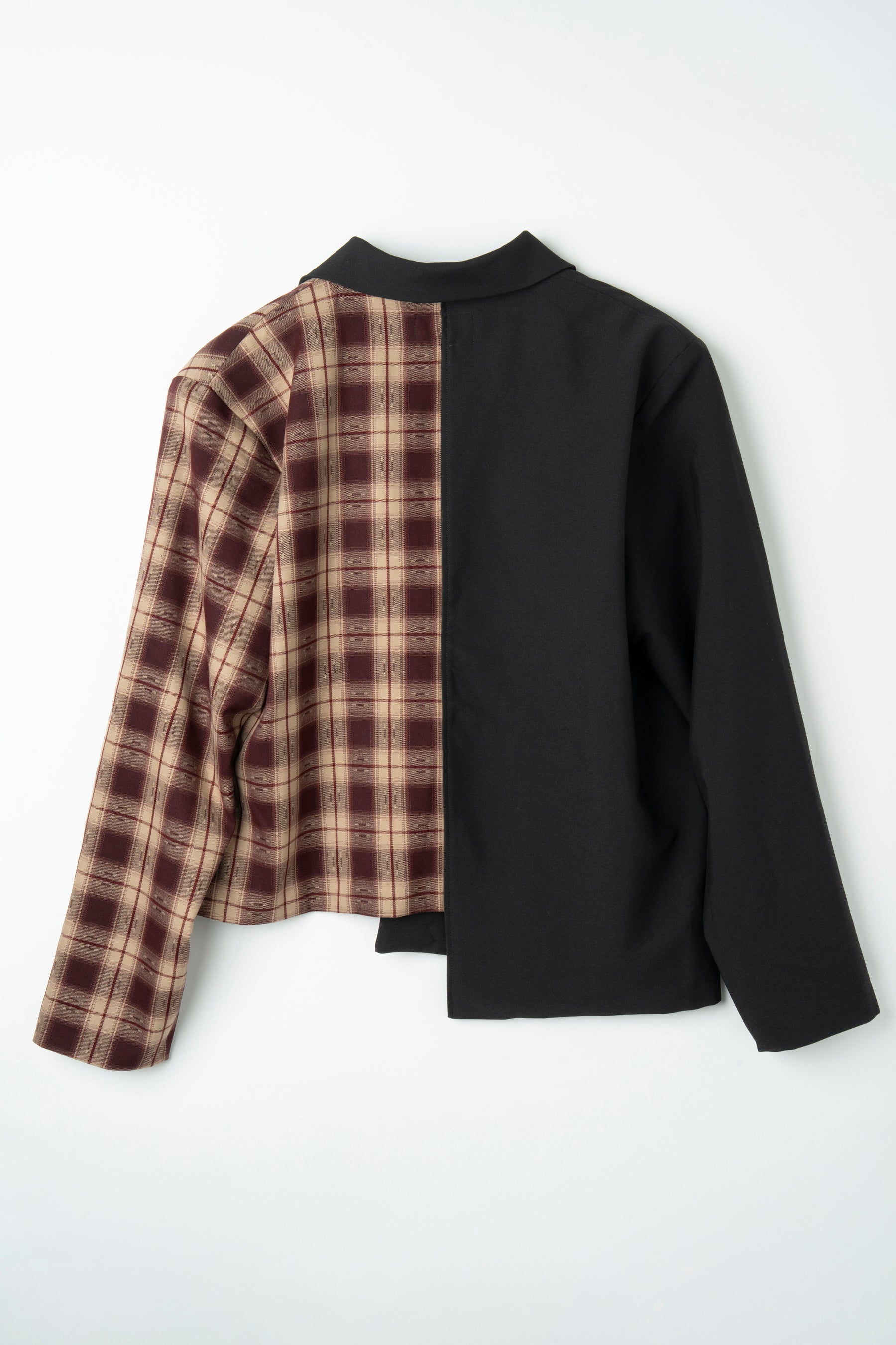 半身を大胆にチェック生地にてドッキングさせた個性溢れる一着。
