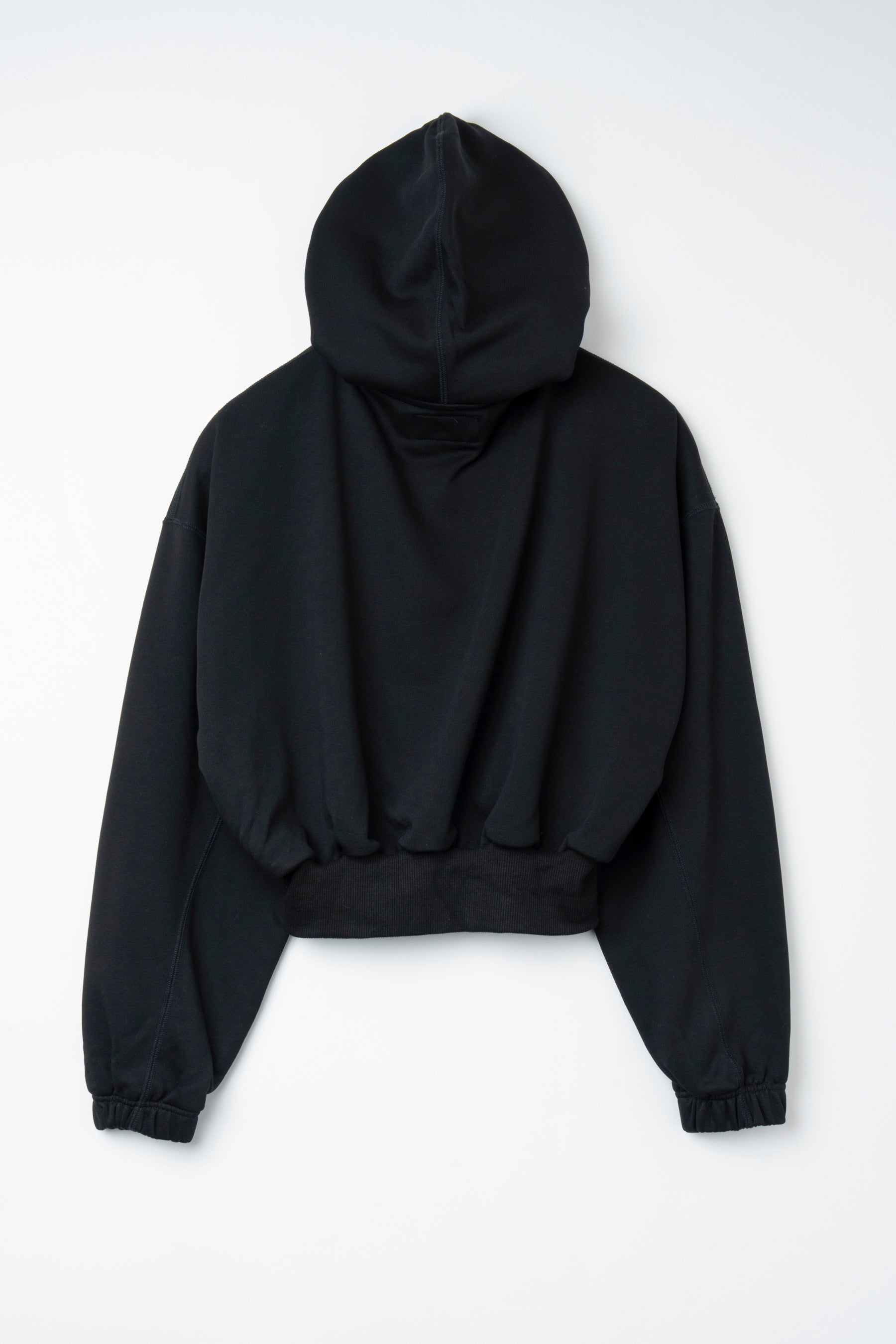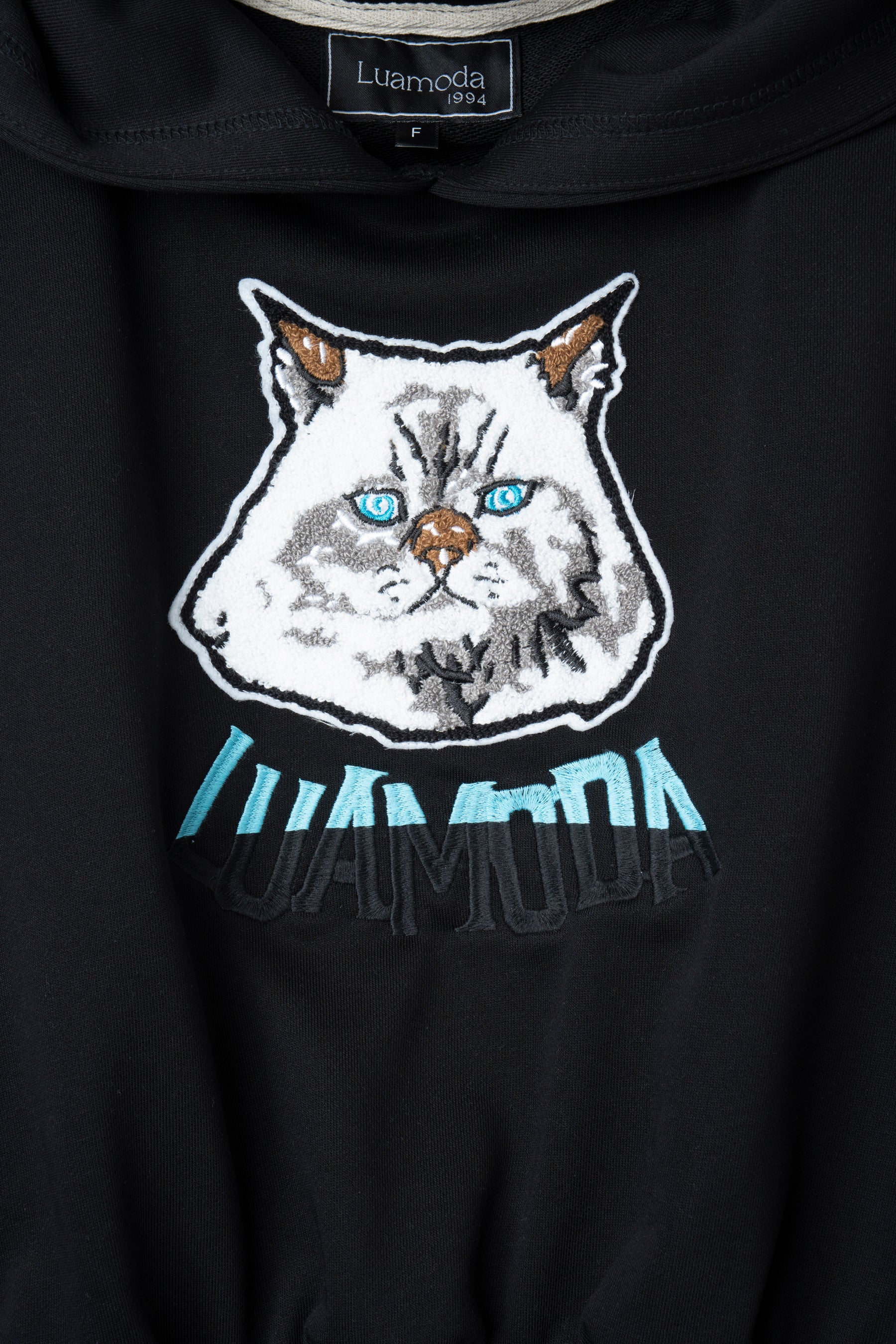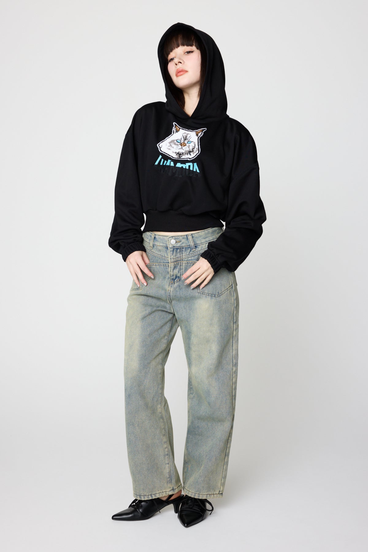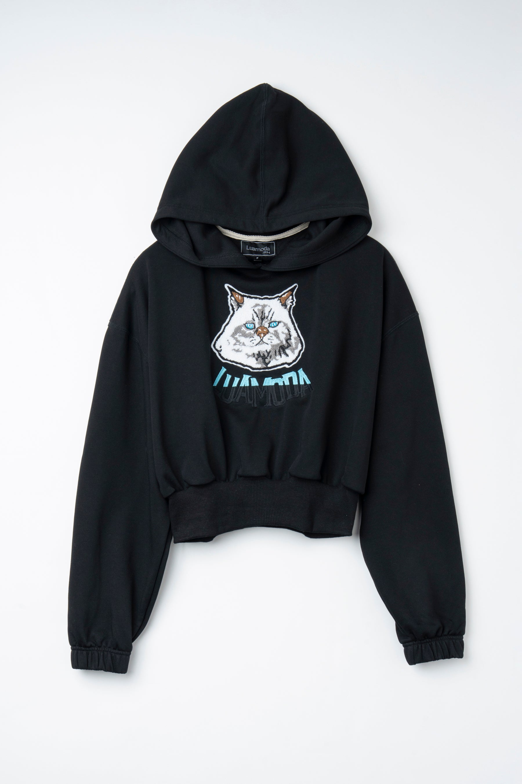 オリジナルのキャットデザインをさがらワッペンにて配したクロップドプルオーバーフーディー。