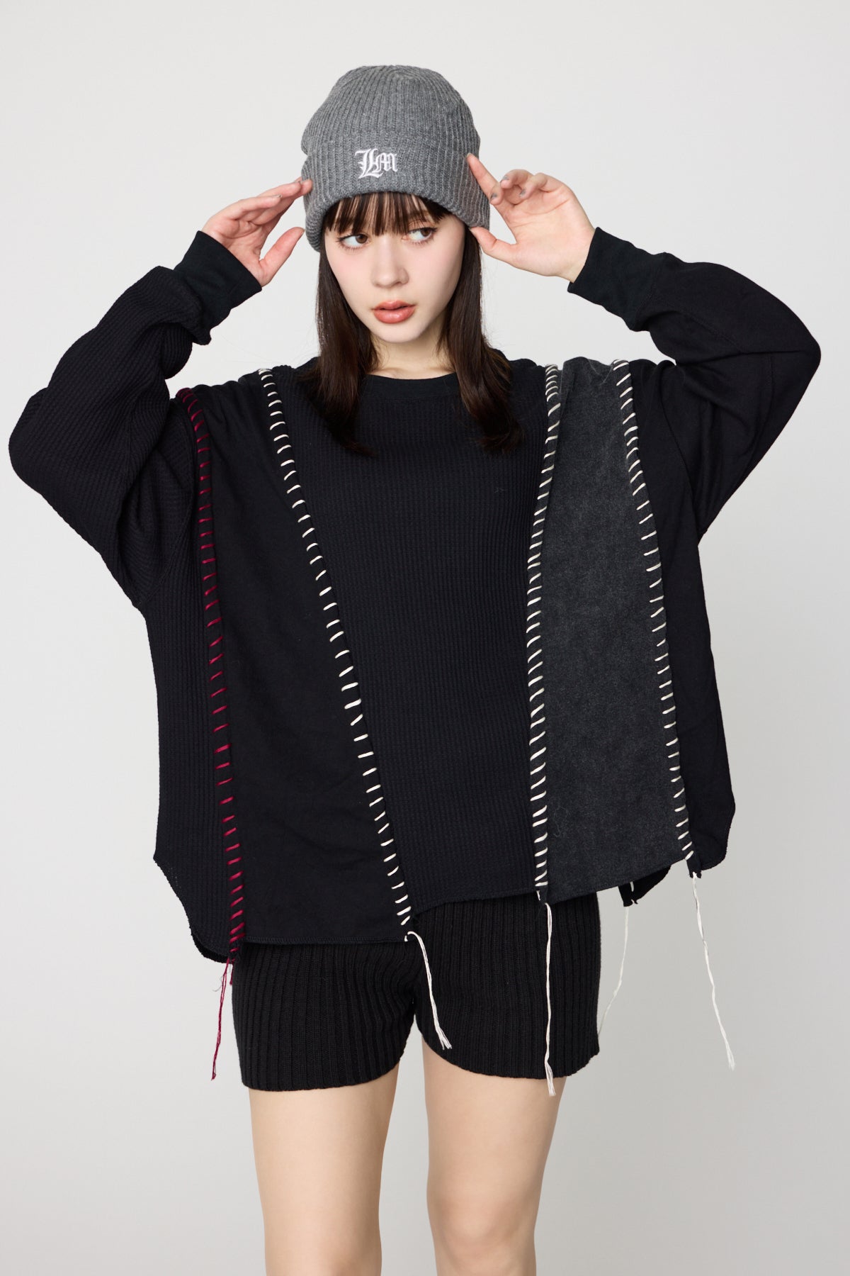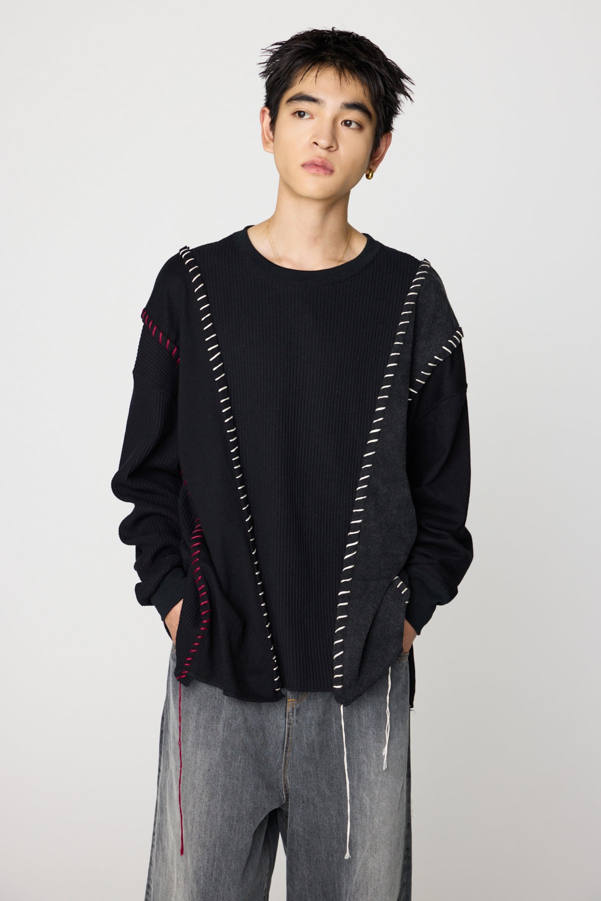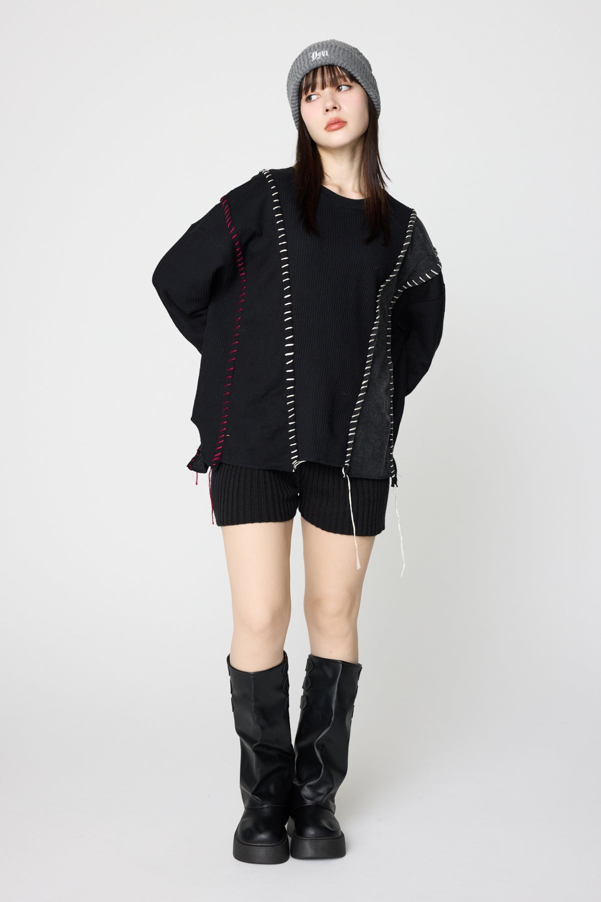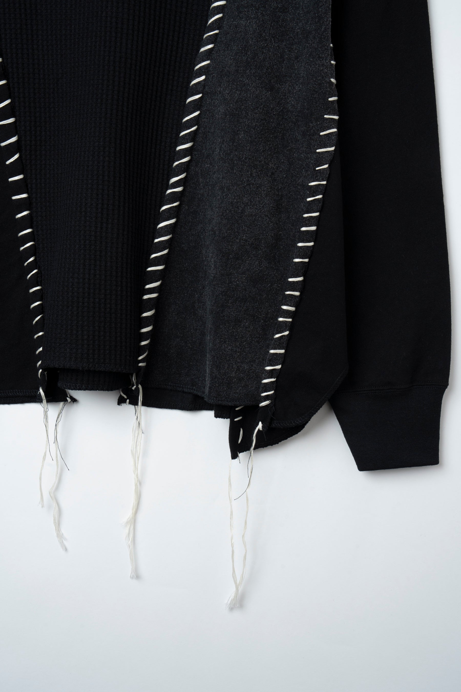 複数の生地で切り替え、パネル毎に着丈を微調節しながらハンドステッチによりアクセントをつけました。