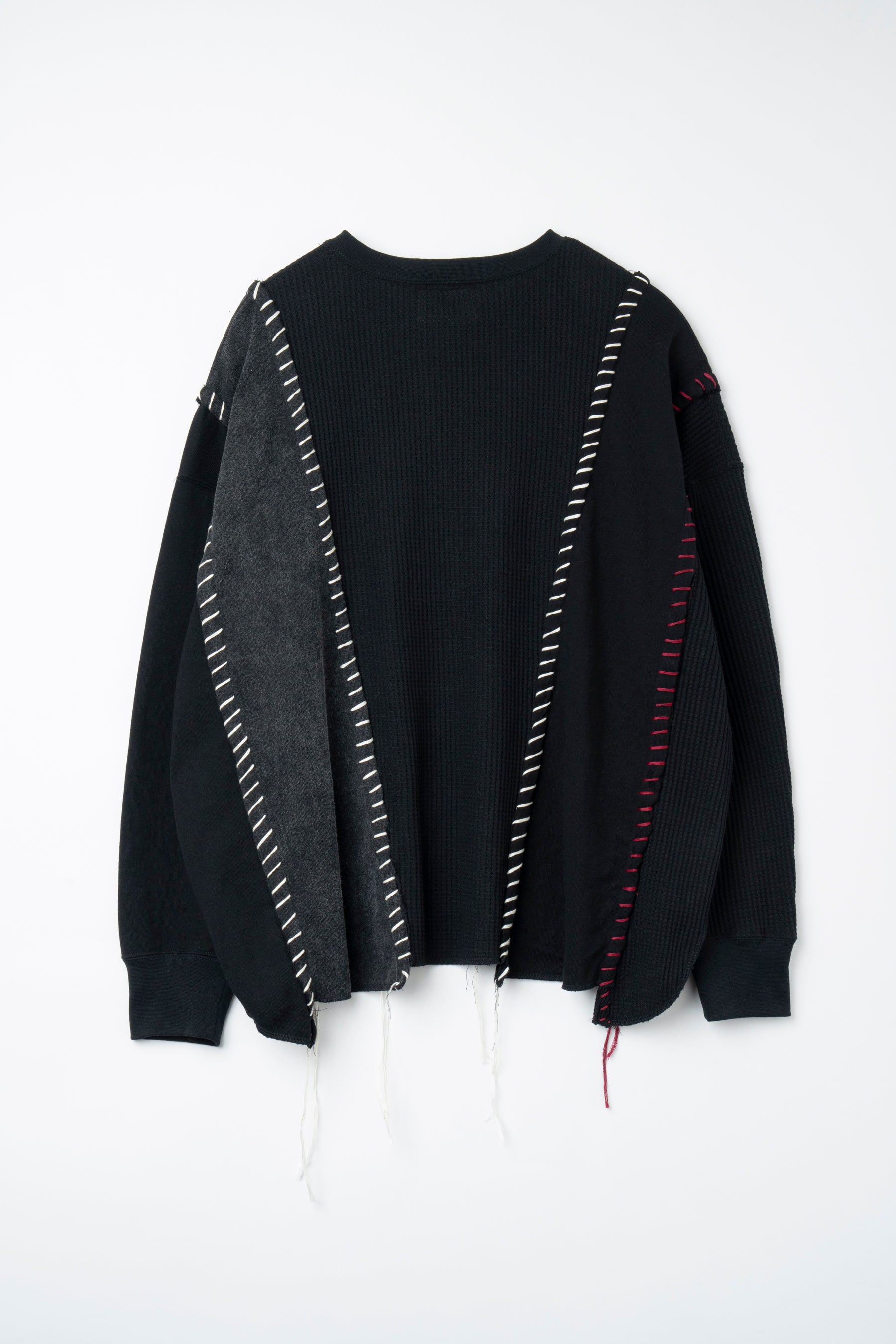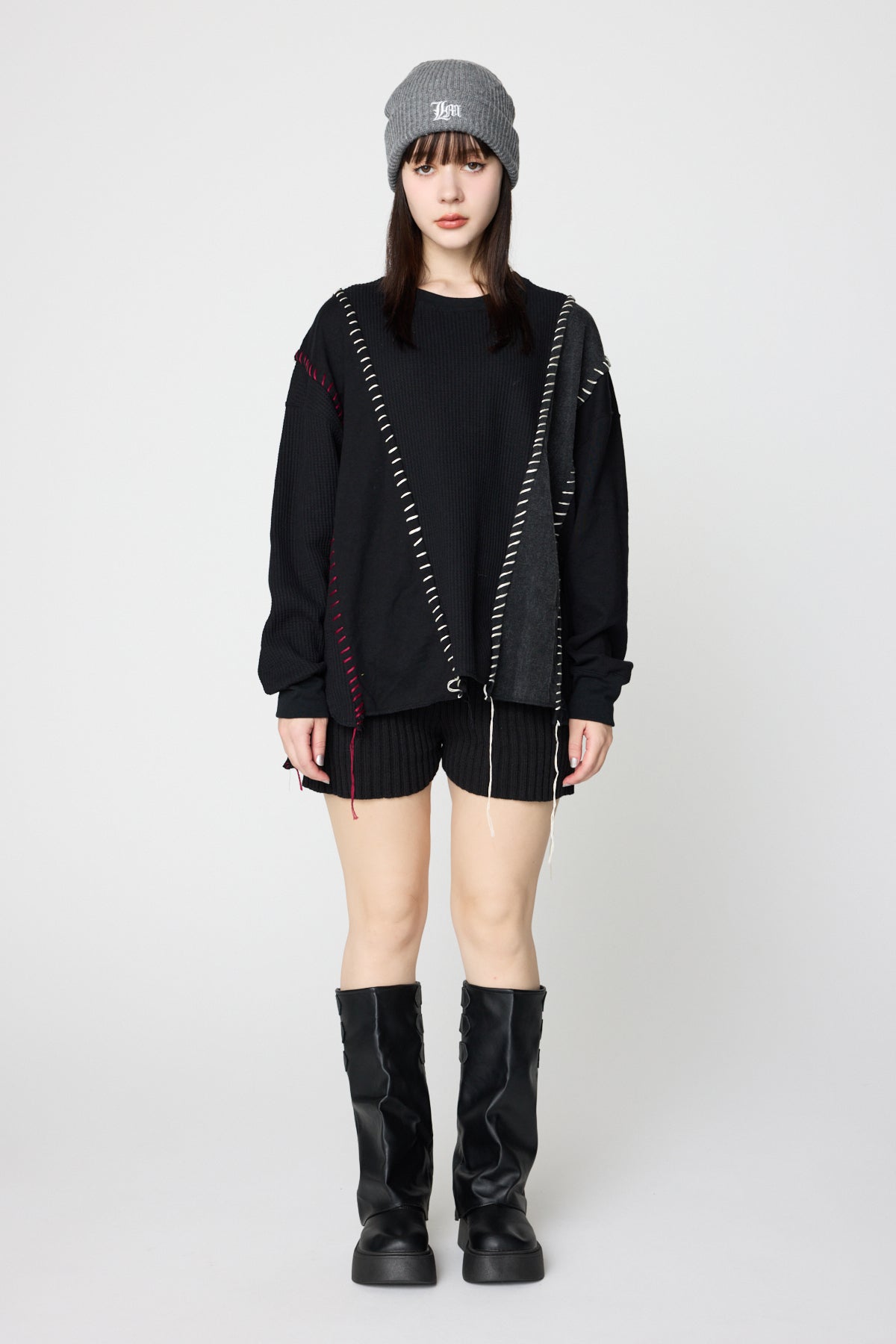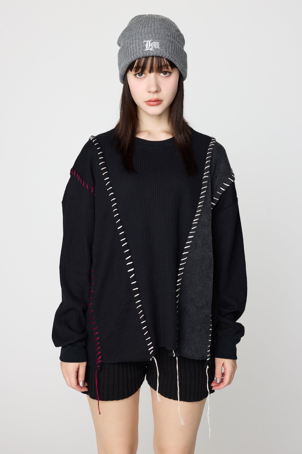 複数の生地で切り替え、パネル毎に着丈を微調節しながらハンドステッチによりアクセントをつけました。
