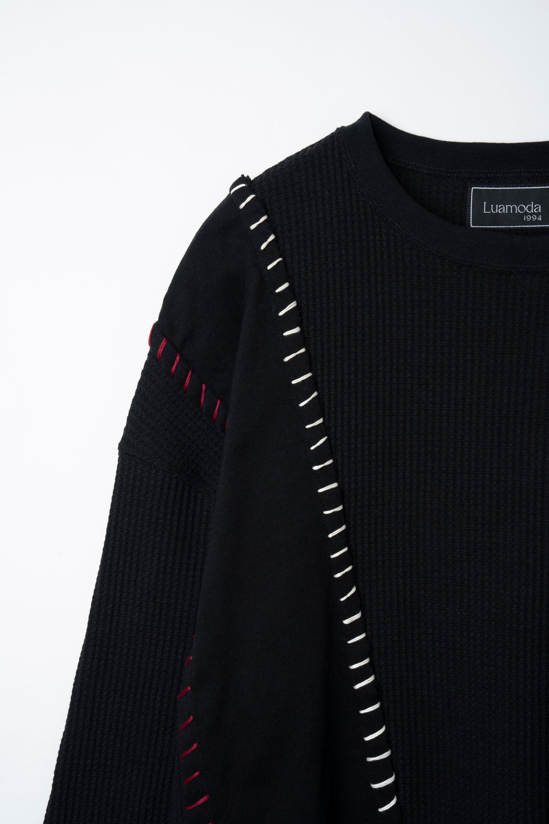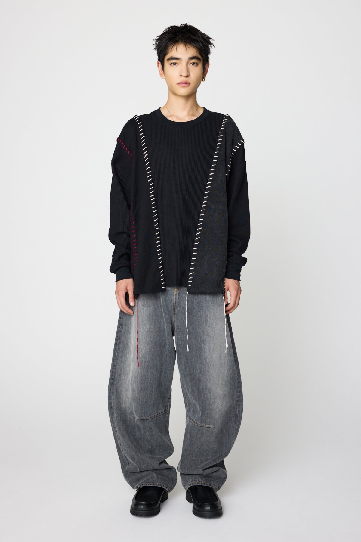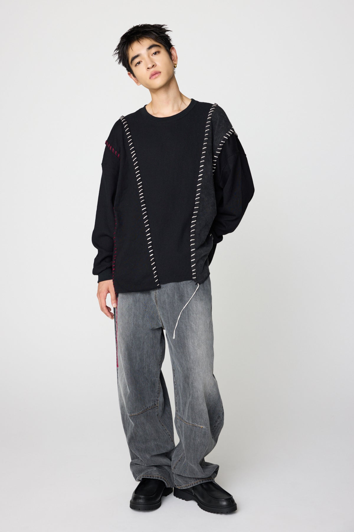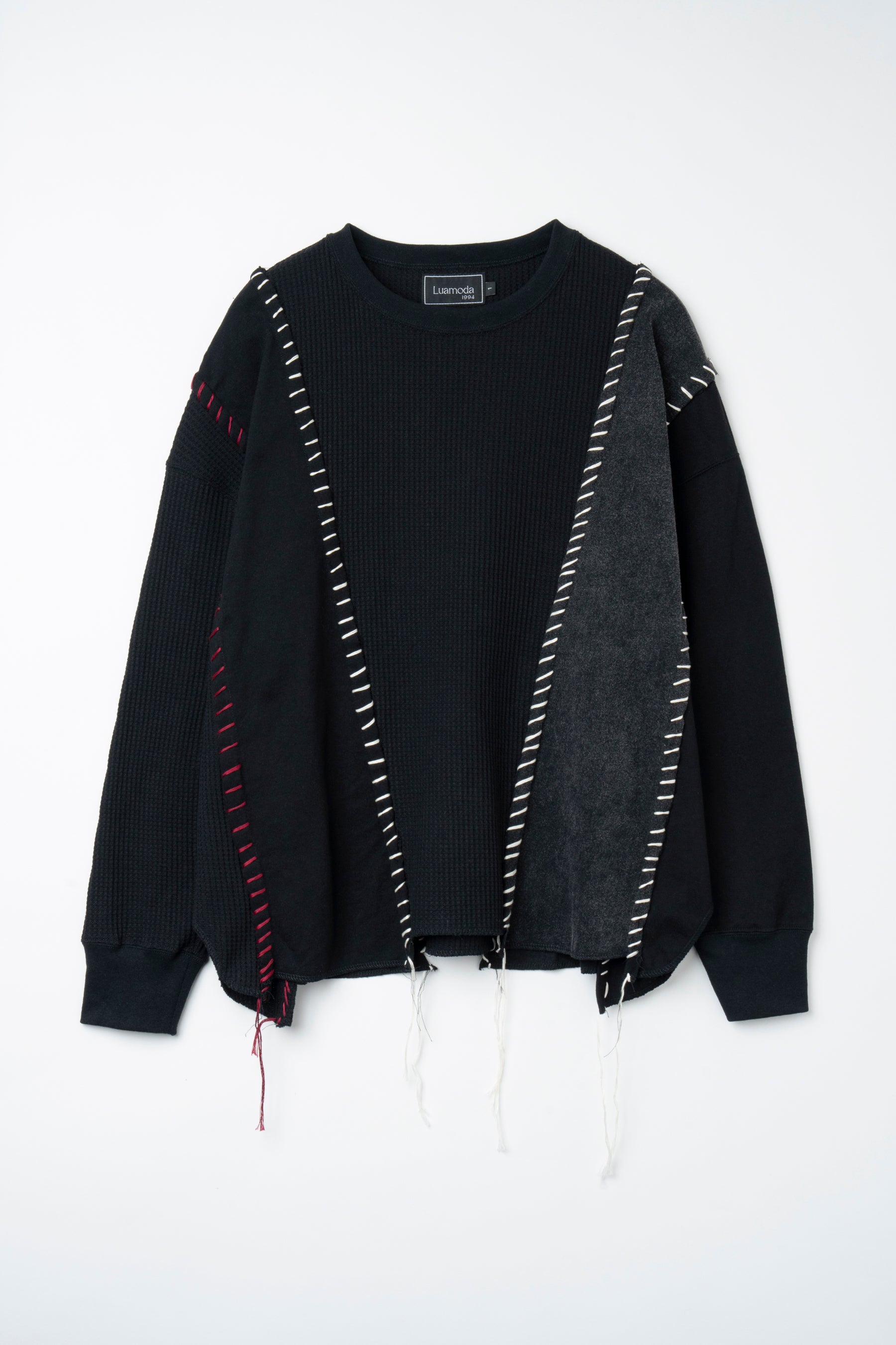 複数の生地で切り替え、パネル毎に着丈を微調節しながらハンドステッチによりアクセントをつけました。
