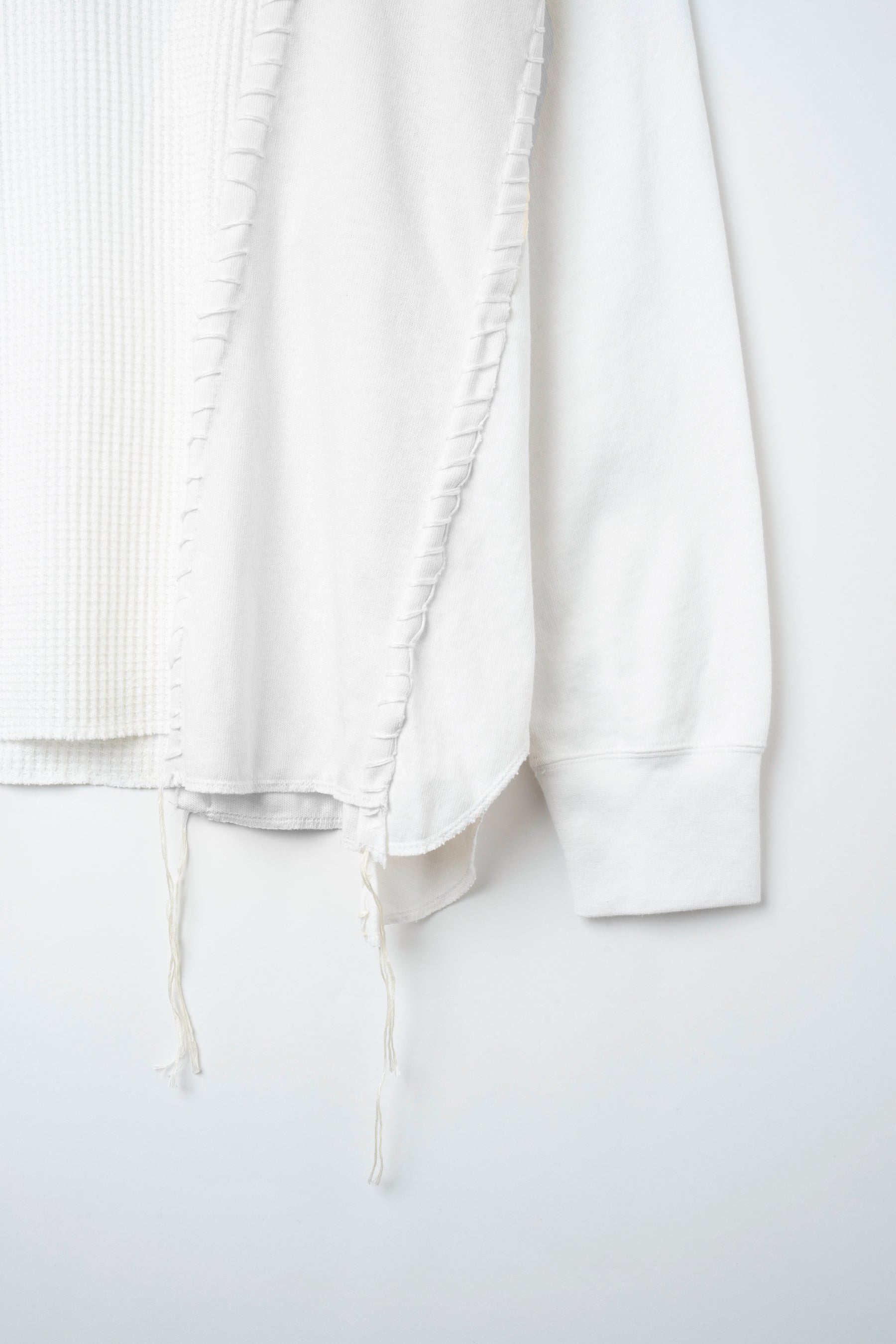 複数の生地で切り替え、パネル毎に着丈を微調節しながらハンドステッチによりアクセントをつけました。